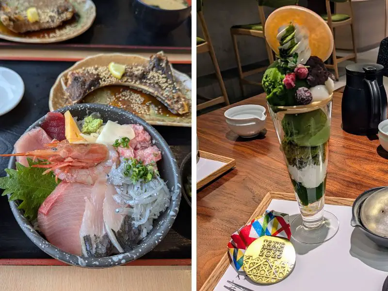 The left photo is a bowl of rice topped with fresh seafood such as tuna, shrimp, and whitebait. Right photo is a multi-layered matcha parfait next to the Tokyo Marathon 2025 finisher medal.